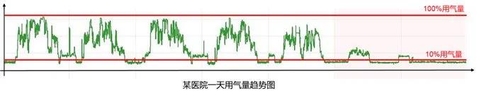 通常医院的压缩空气系统一般均按100%床位数用气量设计选型,往往会采用一台大功率压缩机来进行配置(一台同功率压缩机备用)。但正常情况下医院用气量波动是非常大的(见下图,大部分时间用气量均在10%~50%设计流量),结果往往就是导致大功率压缩机频繁启停,频繁启停不仅会极大的冲击医院电网,更会使得压缩机寿命大大降低或发生故障,压缩空气系统常常处于高风险运行状态下。